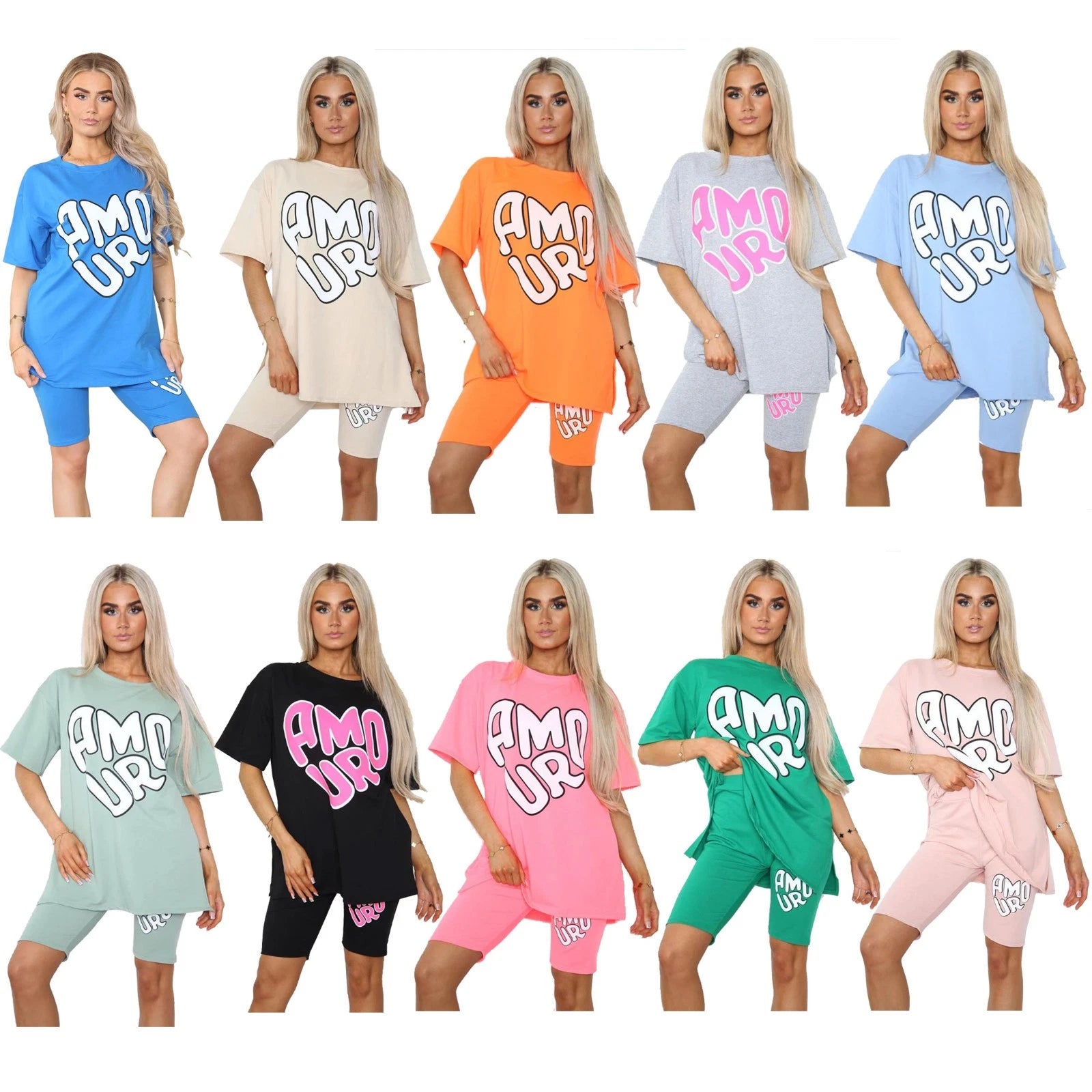 This contemporary two-piece co-ord set combines comfort with on-trend styling. The oversized crew neck tee features a distinctive side slit hem and bold "Amour" graphic print, while the coordinating cycling shorts complete the look. Constructed from soft, lightweight fabric, this set excels in versatility—equally suited to relaxed lounging sessions or casual streetwear moments. The relaxed fit silhouette flatters various body types, whilst the midi-length top and short-length bottoms create a balanced proportion. An essential piece for those prioritising both style and wearability in their everyday rotation.
